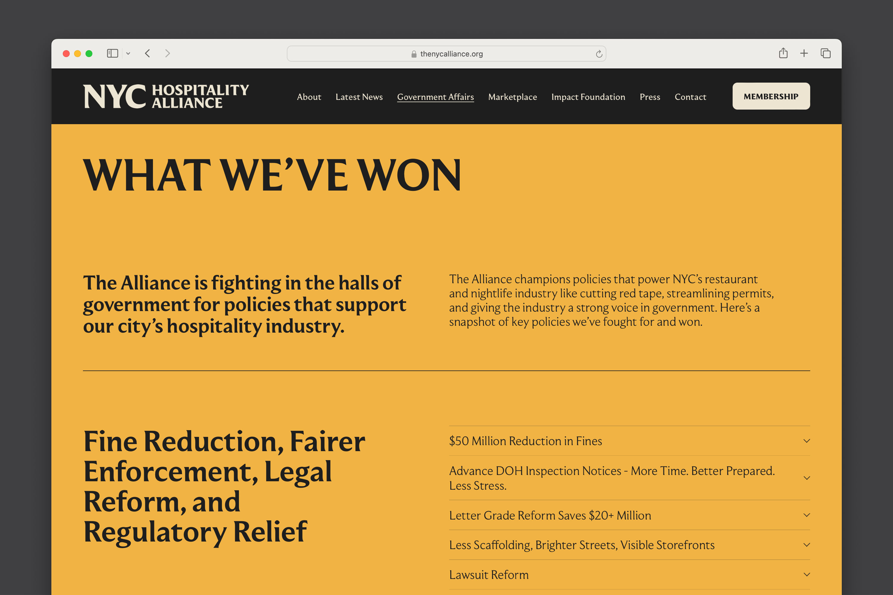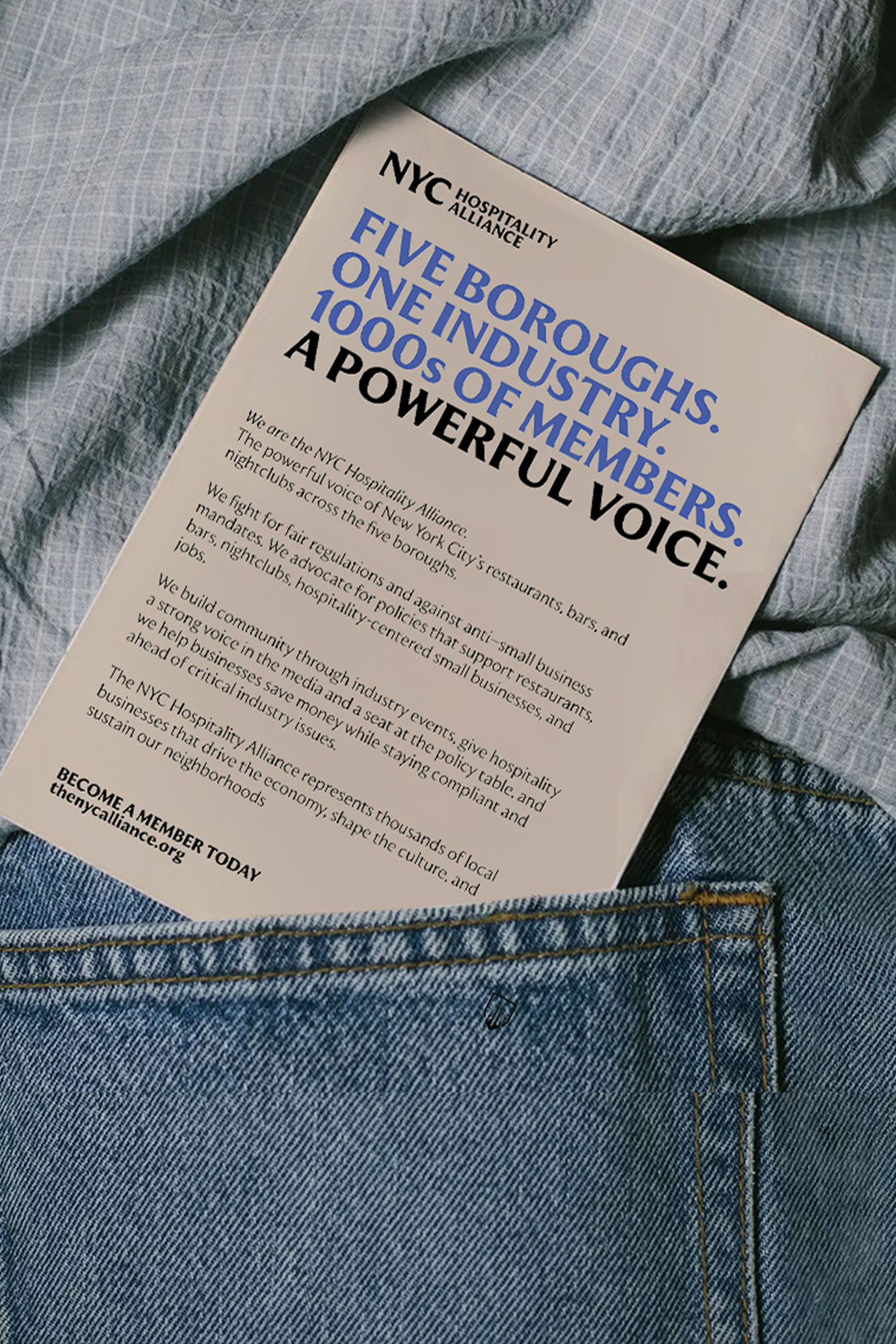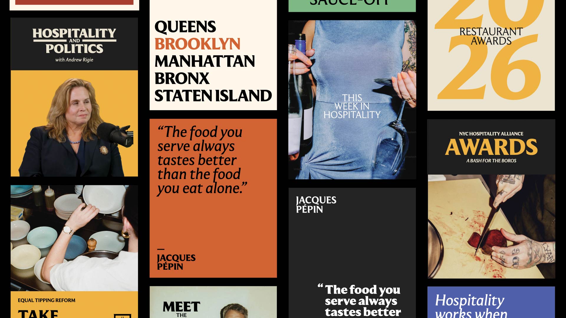 The NYC Hospitality Alliance is the leading voice for New York City’s restaurant and nightlife industry — advocating for more than 25,000 establishments in the halls of government. We worked with Director Andrew Rigie to craft a new visual identity that brings strength to the court room and energy to the dance floor.